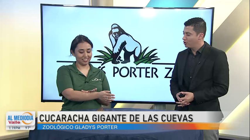 Alejandra Rodríguez, coordinadora de marketing de 'Gladys Porter Zoo' visita Noticias RGV para presentar a la cucaracha gigante de las cavernas, originaria del Centro y Sudamérica.