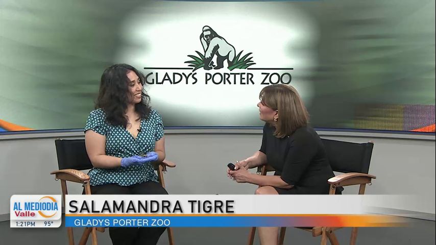 Alejandra Rodríguez, coordinadora de marketing de Gladys Porter Zoo, visita Noticias RGV para presentar a la comunidad a la salamandra tigre.