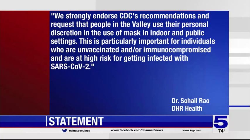 "We strongly endorse CDC's recommendations and request that people in the Valley use their personal discretion in the use of mask in indoor and public settings," said Dr. Sohail Rao, President and CEO of DHR Health Institute for Research and Development. "This is particularly important for individuals who are unvaccinated and/or immunocompromised and are at high risk for getting infected with SARS-CoV-2."