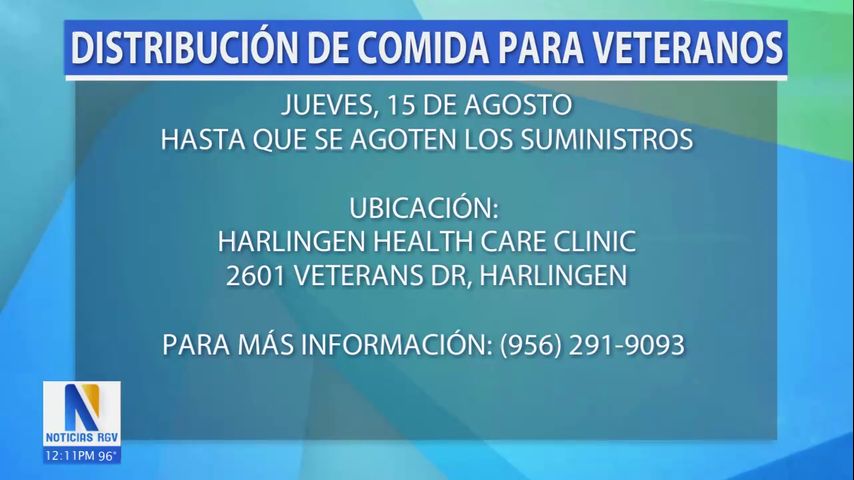 Esto será el jueves 15 de agosto hasta agotar existencia en la clínica médica de Harlingen ubicada en el 2601 Veterans Drive, los veteranos deben de estar inscritos en atención médica en el sistema de atención de VA Texas Valley Costal Bend y presentar una identificación válida para confirmar su condición de veterano.