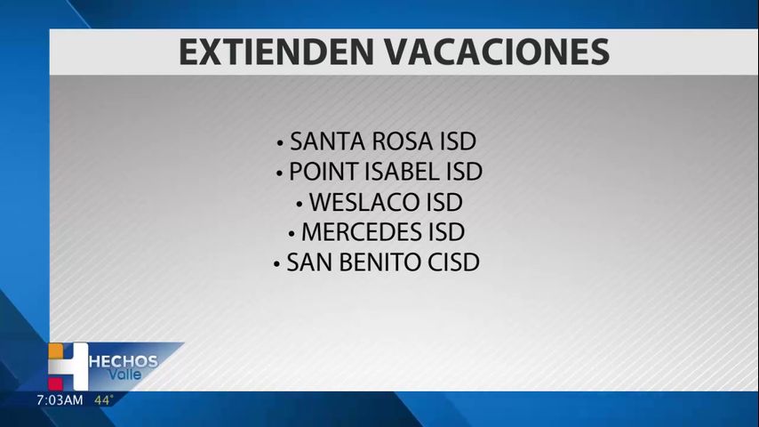 El lunes, otros distritos escolares del Valle también emitieron una extensión de una semana para sus vacaciones de invierno, incluido el Distrito Escolar Independiente de Point Isabel, el Distrito Escolar Independiente Consolidado de San Benito, el Distrito Escolar Independiente de Santa Rosa y el Distrito Escolar Independiente de Mercedes, todos citando el aumento de casos de COVID. como la razón detrás de la extensión.
