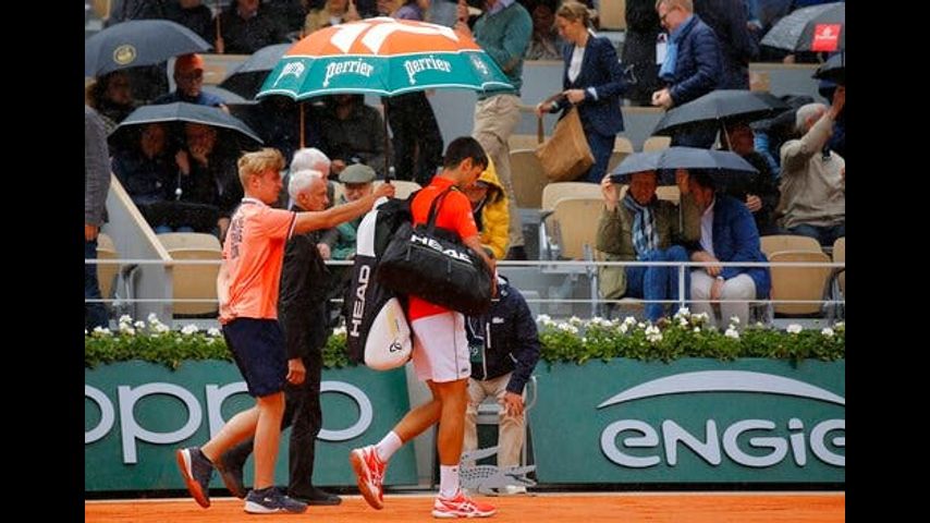 PARIS (AP) - Novak Djokovic's 26-match Grand Slam winning streak is on the line when he and Dominic Thiem resume their rain-suspended French Open semifinal.
