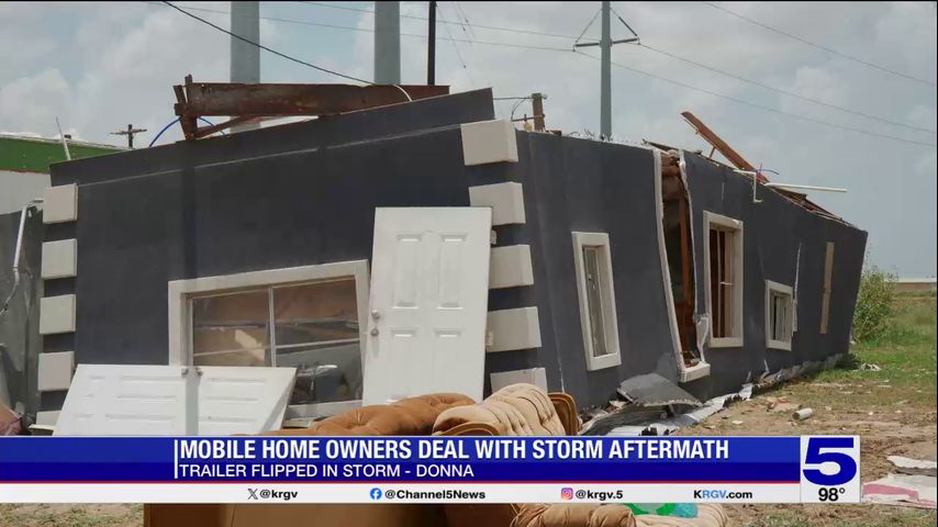 The cleanup continues in Donna, and the storm caused damage to a couple's mobile home, flipping it upside down.