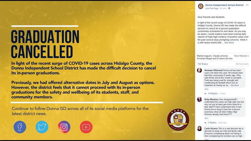 "De acuerdo al reciente incremento de casos de COVID-19 en el condado Hidalgo, Donna ISD tomó la difícil decisión de cancelar sus ceremonias de graduación en persona programadas para la próxima semana," de acuerdo a un comunicado del distrito escolar.