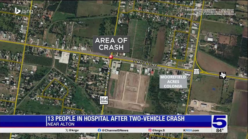 A two-vehicle crash near Alton sent 13 people to a local hospital for "non-incapacitating injuries," according to Texas Department of Public Safety spokesperson Sgt. Maria Hernandez.