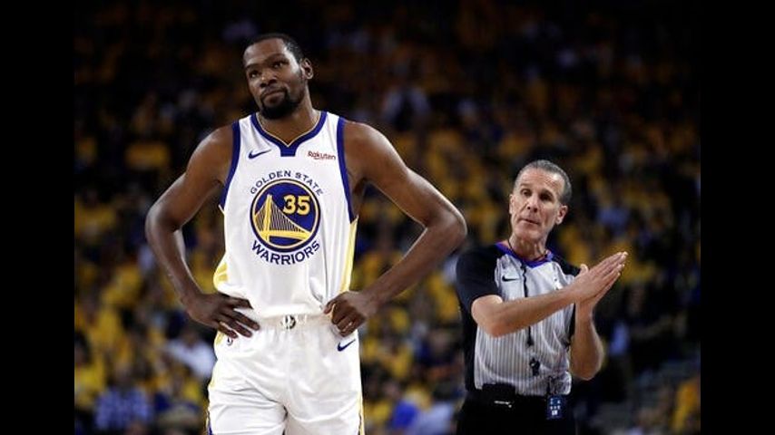 OAKLAND, Calif. (AP) - Kevin Durant is traveling with the Golden State Warriors to Toronto for the first two games of the NBA Finals, leaving open the chance he could be ready to return from a strained right calf in time for Game 2.