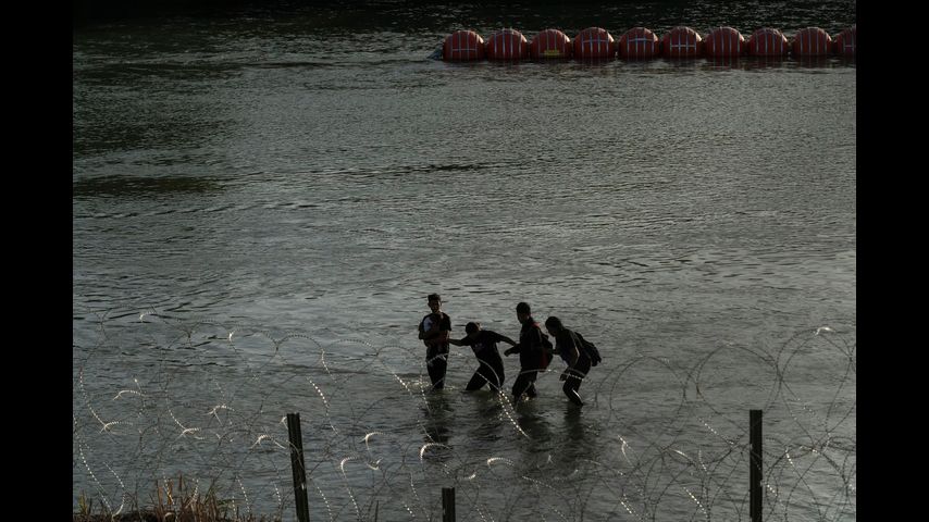 The river is shallow enough in this part of the border that migrants can be seen walking around the barrier.