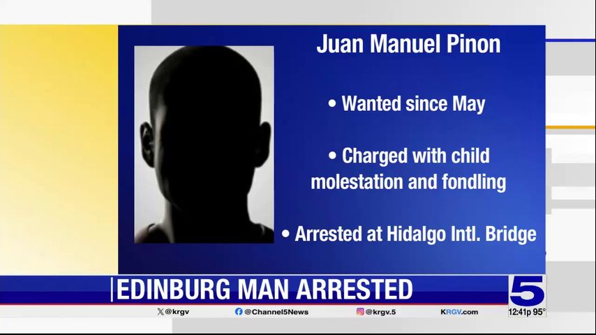 The spokesperson said Pinon has been wanted since May and is being charged with child molestation and child fondling. A Hidalgo police officer took custody of Pinon to arraigned transport to Starr County.