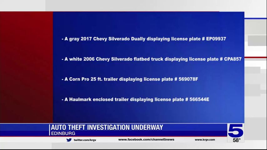 Those with information on the vehicles are urged to contact the Edinburg Police Department at 956-289-7700 or the Edinburg Crime Stoppers line at 956-383-8477.