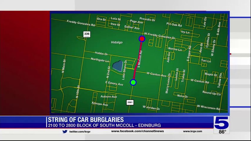 Edinburg police got several calls Friday about 24 car burglaries from people in neighborhoods off south McColl Road near the area north of Walmart on Trenton and south of the HEB on Freddy Gonzalez.