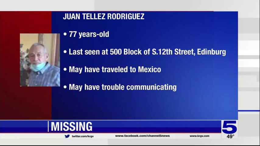 The Edinburg Police Department is searching for Juan Tellez-Rodriguez, 77, who was last seen on foot at about 1:30 p.m. at an assisted living facility on the 500 block of South 12th Avenue.