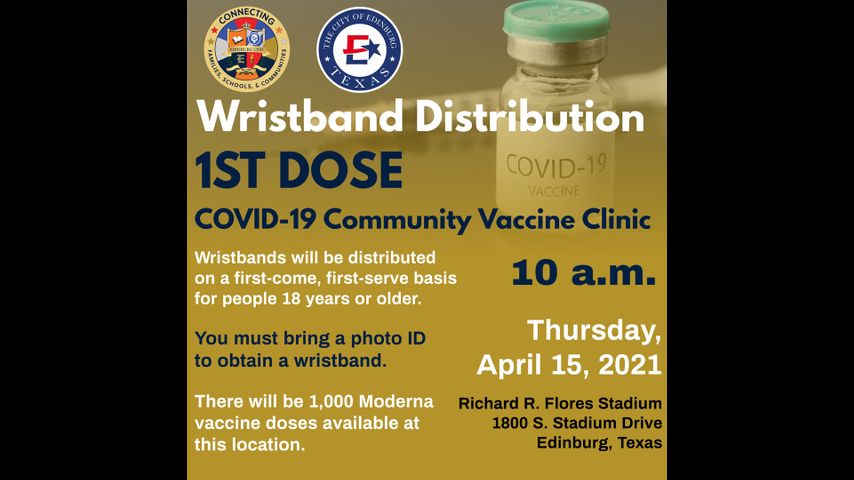 The city of Edinburg and Edinburg CISD will distribute 1,000 wristbands starting at 10 a.m. on Thursday, April 15, at the Richard R. Flores Stadium.