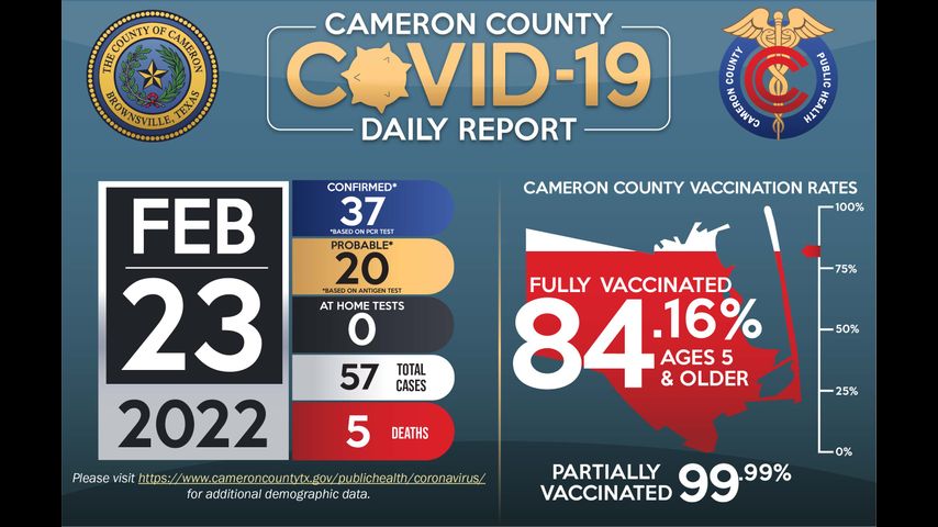 Los esfuerzos de vacunación continúan en todo el condado de Cameron; actualmente, el 84,16% de la población de cinco años y más está completamente vacunada.