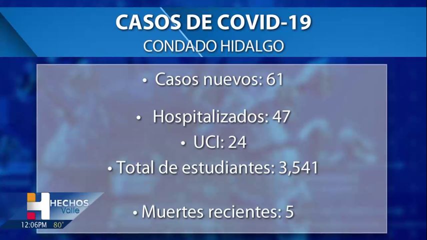 En los distritos escolares del condado de Hidalgo, 36 estudiantes y dos miembros del personal dieron positivo por COVID-19. Un total de 697 miembros del personal y 3,541 estudiantes dieron positivo por el virus desde que el condado comenzó a reportar infecciones relacionadas con la escuela el 18 de agosto.