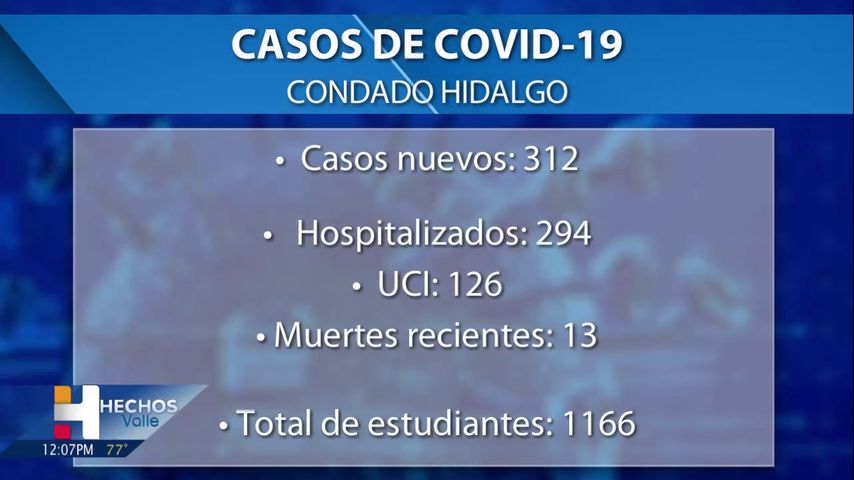 En todos los distritos escolares del condado Hidalgo, se informaron 11 nuevas infecciones positivas entre el personal y se informaron 28 nuevas infecciones entre los estudiantes. Esto eleva el recuento total a 377 infecciones totales del personal y 1,166 infecciones totales de estudiantes desde que el condado comenzó a informar infecciones escolares el 18 de agosto.