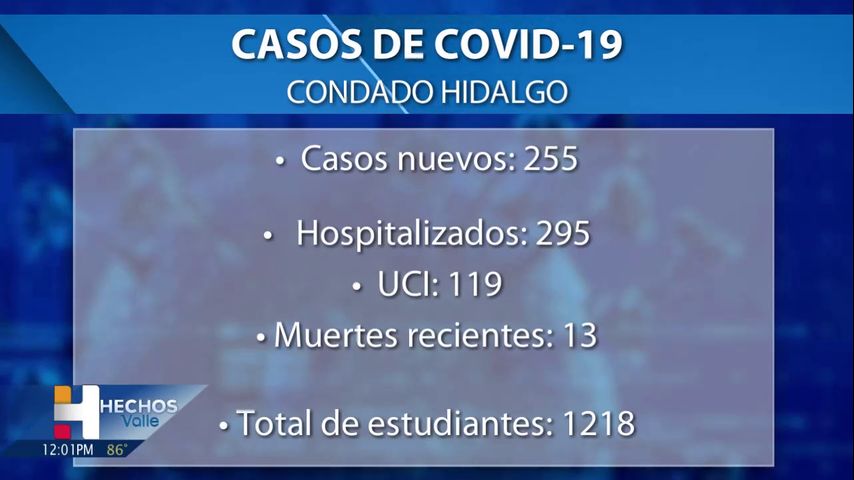En todos los distritos escolares del condado de Hidalgo, se informaron cuatro nuevas infecciones positivas entre el personal y se informaron 52 nuevas infecciones entre los estudiantes. Esto eleva el recuento total a 381 infecciones totales del personal y 1,218 infecciones totales de estudiantes desde que el condado comenzó a informar infecciones escolares el 18 de agosto.