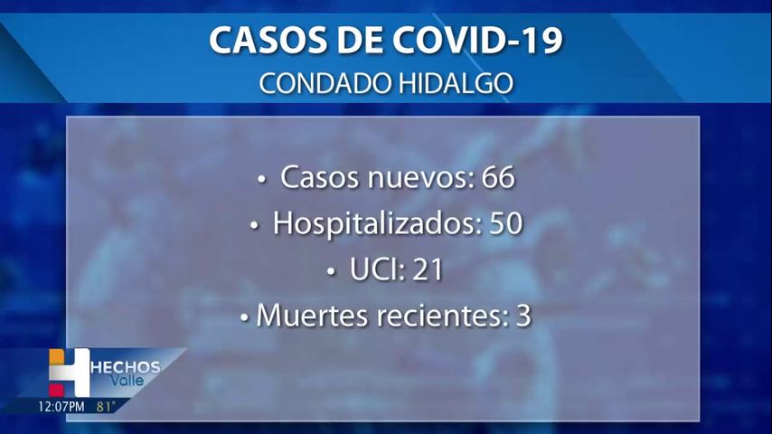 El condado Hidalgo informó el viernes tres muertes relacionadas con el coronavirus y 66 nuevos casos positivos de COVID-19, según un informe del Departamento de Salud y Servicios Humanos del condado Hidalgo.