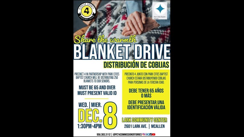 Como parte de una asociación con la Iglesia Bautista Park Cities, el Precinto 4 del Condado Hidalgo distribuirá 250 mantas a personas mayores de 65 años o más.