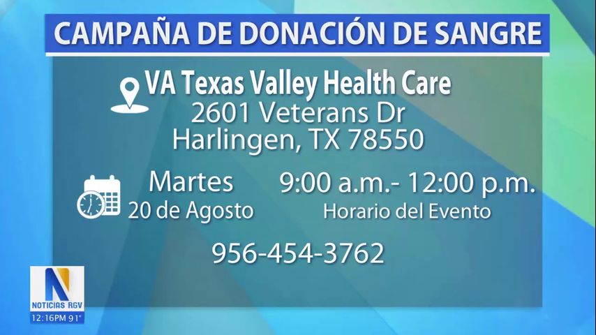 Las dominaciones de sangre se necesitan en todo momento. Por eso en esta ocasión le están pidiendo que este 20 de agosto realiza su buena acción y done este importante líquido desde las 9 AM hasta las 12PM en el Harlingen VA Outpatient Clinic, 2106 Treasure Hills BLVD.