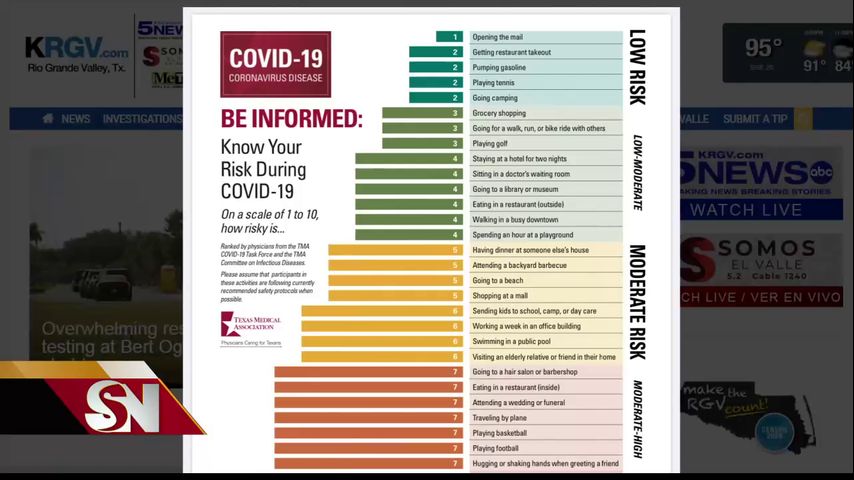 Agrega que ya es tiempo de que la comunidad haga su parte y recomienda a la gente a que observen la gráfica creada por la asociación Texas Medical que codifica por color y enlista numéricamente las actividades consideradas de alto o poco riesgo.