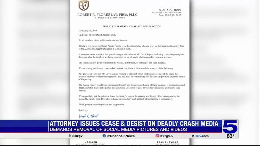 “The family is saying, ‘no, you're not gonna use our family member who passed in a horrific way for your own benefit,” attorney Robert Flores told Channel 5 News. “Cease and desist letters exist for those very reasons, to protect private figures in public spaces when their information or their pictures are used without their consent or in an intrusive or offensive manner."