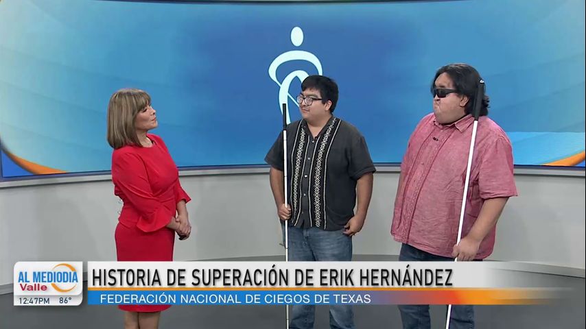Erik Ivan Hernández y el mentor Daniel Martínez visitan Noticias RGV para compartir su historia de superación personal y cómo Erik fue beneficiario de una beca otorgada por la Federación Nacional de Ciegos de Texas.