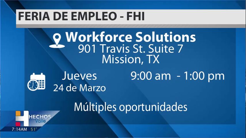 Este jueves se está ofreciendo una feria de empleo, un evento especial de contratación, la empresa FHI es una agencia de empleo que estarán hoy desde las 9:00 a.m. a la 1:00 p.m. en el edificio de WorkForce Solution en Mission ubicado en el 901 de la calle Travis, suite # 7, tendrán múltiples oportunidades de empleo.