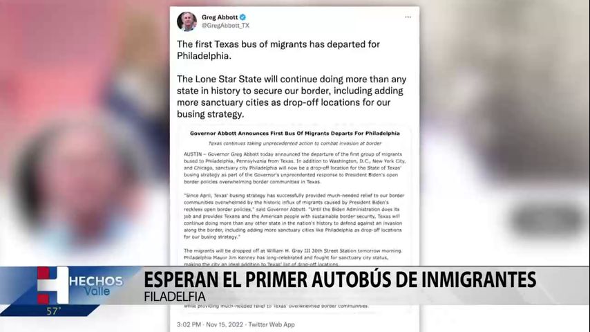 Abbott no dijo cuántos inmigrantes había a bordo o si más de un autobús se dirigía a Filadelfia, pero dijo que el "primer autobús" llegaría el miércoles.