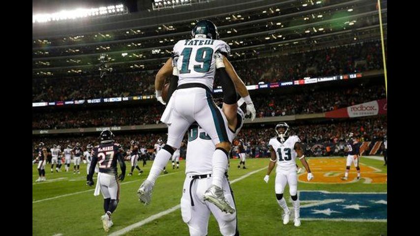 The defending league champion Eagles (10-7) squeezed into the playoffs by beating Washington and having the Bears (12-5) help them by knocking off Minnesota in the season finale. Philadelphia thanked its benefactor with a 12-play, 60-yard drive on which Foles, the Super Bowl MVP last February, hit six passes.