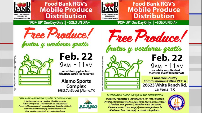 The Food Bank of the RGV will hold two produce distribution sites in Hidalgo and Cameron counties on Wednesday.