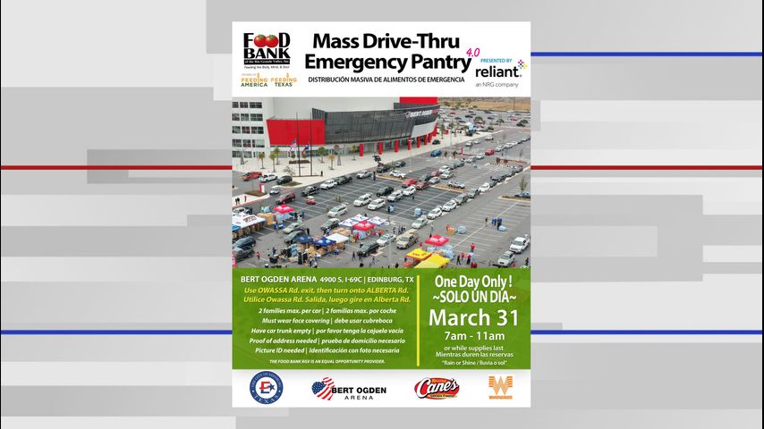 The Food Bank of the Rio Grande Valley will hold a mass drive-thru food distribution event on Wednesday, March 31, at the Bert Ogden Arena in Edinburg.