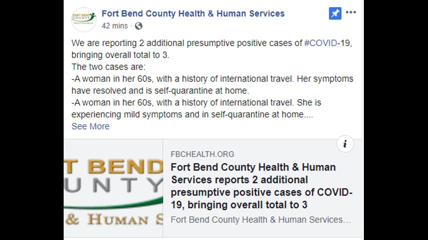 According to their Facebook post, additional coronavirus test results came back identifying 2 additional presumptive positive cases of COVID-19 in Fort Bend County residents. The specimens were tested at the City of Houston Laboratory and will be sent to the CDC laboratory for further confirmation.