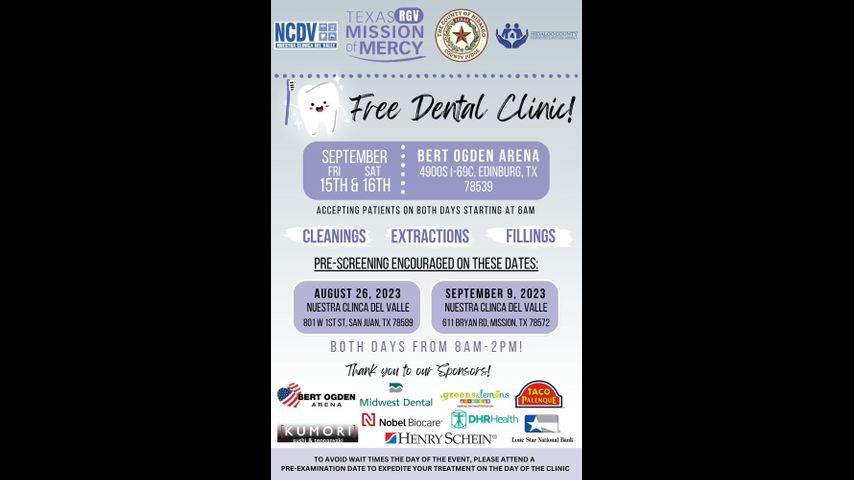 The free dental clinic is set for Friday, Sept. 15, and Saturday, Sept. 16 at the Bert Ogden Arena, located at 49000S I-69C in Edinburg.