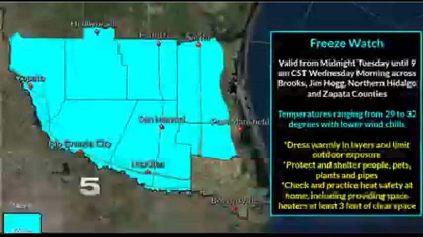 The National Weather Service extended the freeze watch to include all of Hidalgo and Starr counties and inland Willacy County; it begins late Tuesday night and into Wednesday morning.