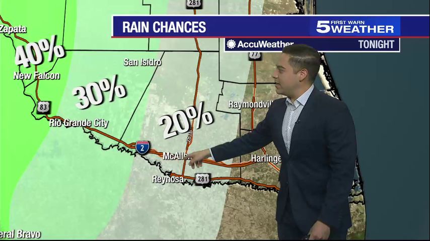 There is also a small risk for thunderstorms tonight in the upper valley. Thunderstorms may develop over the Sierra Madre mountain range over Nuevo León, Mexico. These storms usually weaken and fade away as they move closer to the Rio Grande. It's possible they could survive and impact the upper valley, mainly Starr and Hidalgo County. The chance of that happening is a low, 20%. Stay weather aware just in case the storms survive.
