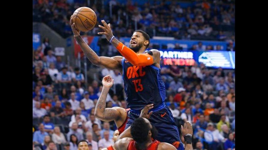 OKLAHOMA CITY (AP) - Paul George hit the game-winning 3-pointer with 1.8 seconds left, and the Oklahoma City Thunder rallied from 14 points down in the fourth quarter to beat the Houston Rockets 112-111 on Tuesday night.