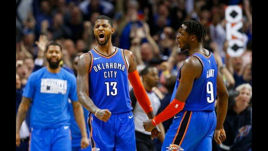 OKLAHOMA CITY (AP) - Paul George floated in a basket with less than a second remaining in double-overtime, capping a 45-point night with the winning shot in the Oklahoma City Thunder's 148-147 victory over the Utah Jazz on Friday.