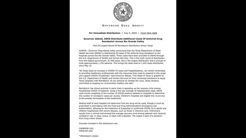 AUSTIN – Texas Governor Greg Abbott announced Saturday that the Texas Department of State Health Services (DSHS) is distributing 40 cases of the antiviral drug remdesivir to ten hospitals across the Rio Grande Valley.