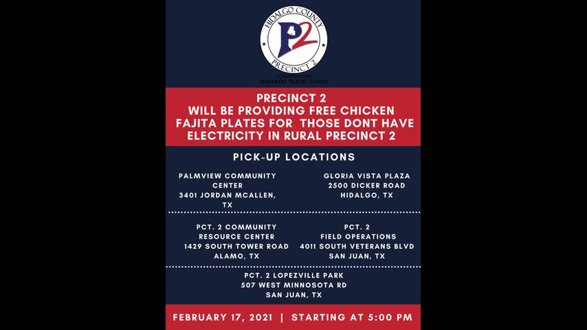 Free hot meals will be provided for Hidalgo County Precinct 2 residents beginning at 5 p.m. on Wednesday at five locations across the county.