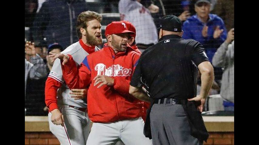 NEW YORK (AP) - Bryce Harper bolted from the dugout to angrily confront the plate umpire after being ejected Monday night, and it took three members of the Philadelphia Phillies to hold back the enraged slugger.