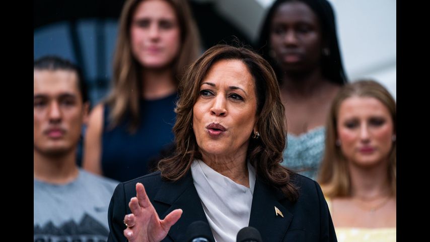 Vice President Kamala Harris speaks during an event with NCAA athletes on the South Lawn of the White House on July 22.