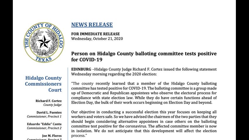 According to a news release from Hidalgo County, "The county recently learned that a member of the Hidalgo County balloting committee has tested positive for COVID-19."
