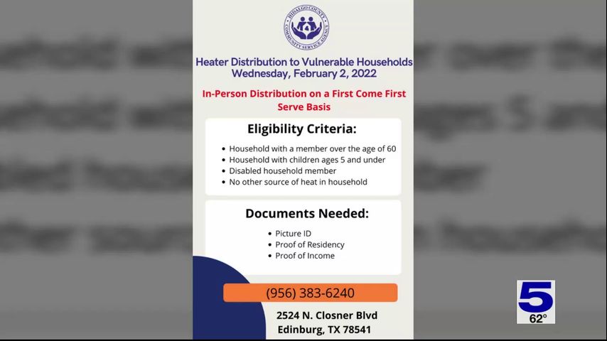 Hidalgo County will distribute space heaters in person to qualifying residents on Wednesday.