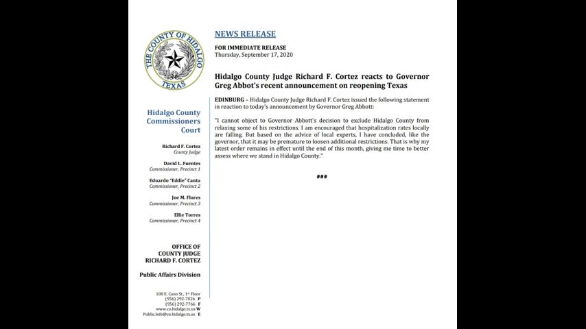 “I cannot object to Governor Abbott's decision to exclude Hidalgo County from relaxing some of his restrictions. I am encouraged that hospitalization rates locally are falling. But based on the advice of local experts, I have concluded, like the governor, that it may be premature to loosen additional restrictions. That is why my latest order remains in effect until the end of this month, giving me time to better assess where we stand in Hidalgo County," said Judge Cortez in a statement.