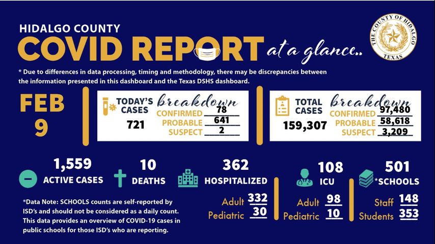 Hidalgo County on Wednesday reported 10 coronavirus-related deaths and 721 positive cases of COVID-19, according to a report from the Hidalgo County Health and Human Services Department.