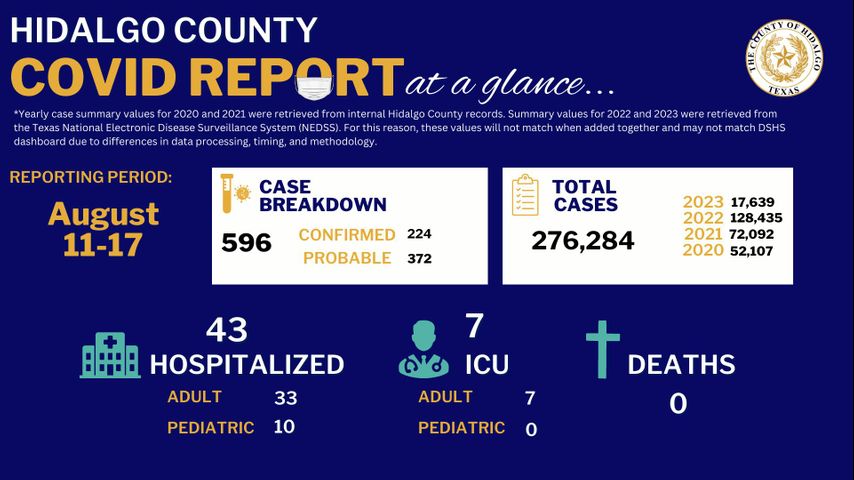 In their previous breakdown released on Friday, Aug. 18, Hidalgo County reported 596 new cases of the diseases and 43 Covid-related hospitalizations.
