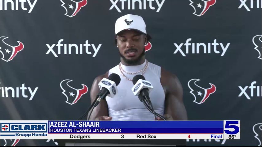 Houston, TX --Houston Texans Linebacker Azeez Al-Shaair shares the heartwarming story about his relationship with Offensive Coordinator Nick Caley.
