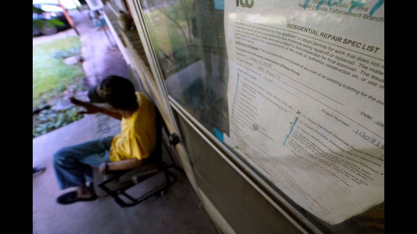 HOUSTON (AP) — The faded and weathered construction permits still taped to Houston resident Mal Moses' front door are reminders of the difficulties he faced in trying to get his mold-infested walls and leaky roof repaired after Hurricane Harvey in 2017.