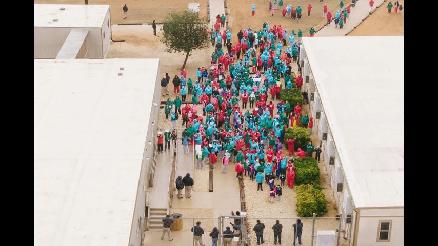 Aerial photos taken by The Associated Press showed children and parents at the South Texas Family Residential Center clad in jackets and sweaters, some of them holding signs that included "Libertad para los niños," or "Liberty for the kids."