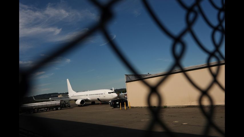 FILE - A U.S. Immigration and Customs Enforcement flight operates out of King County International Airport-Boeing Field, Aug. 23, 2025, in Seattle. (AP Photo/Lindsey Wasson, File)